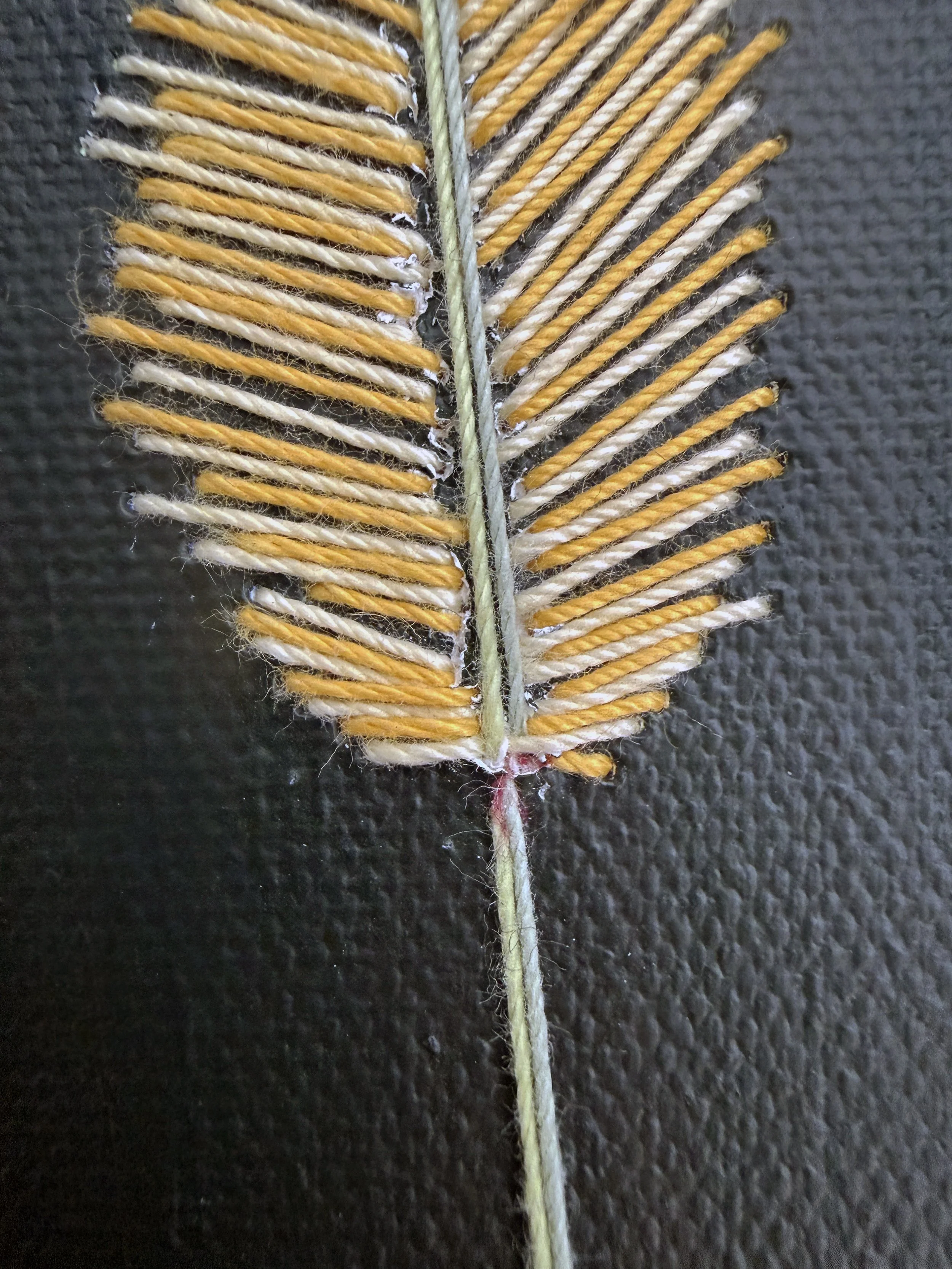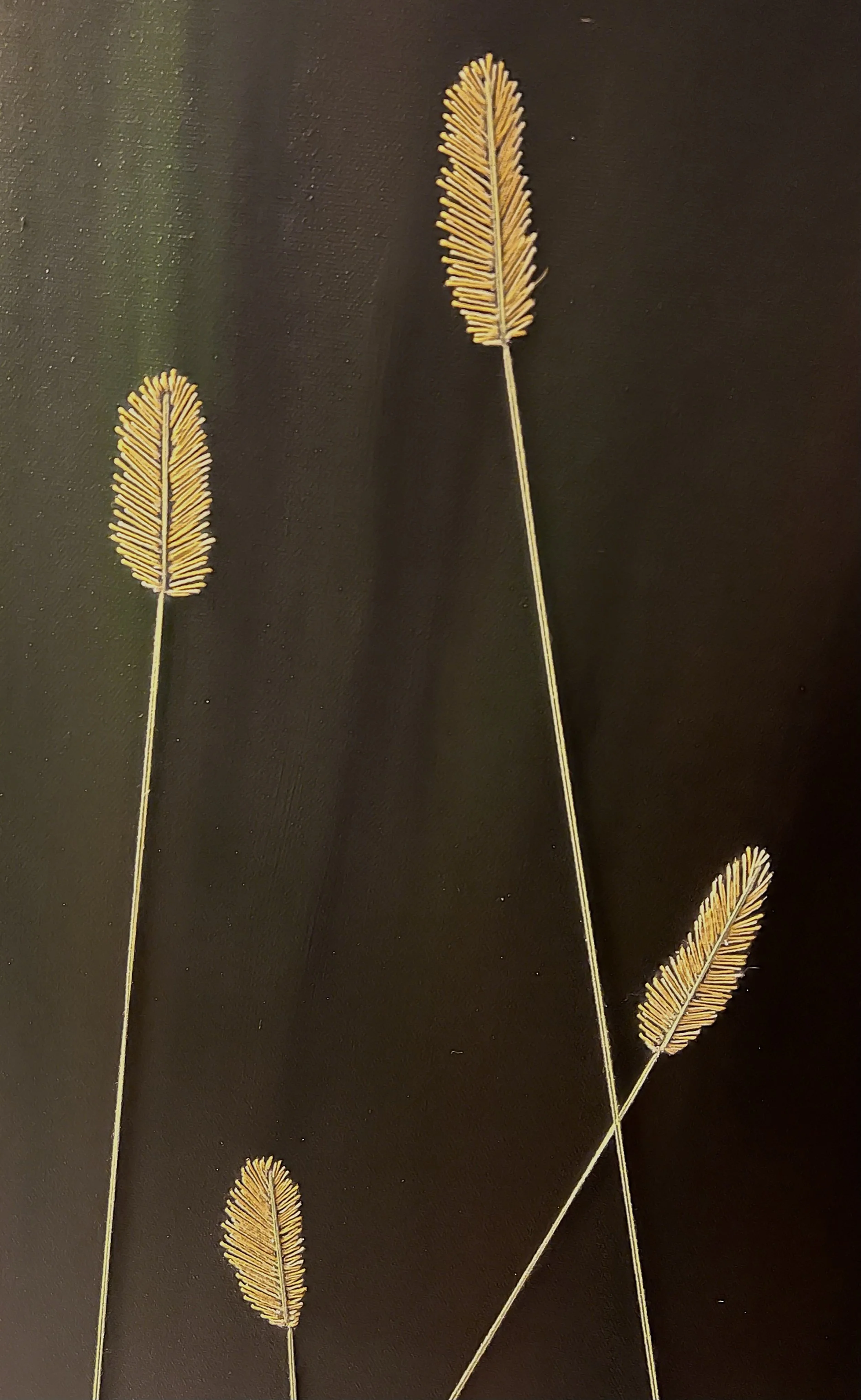 Process: I always mix my paints directly onto the canvas, a repetitive soothing process that hopefully avoid muddiness. I then turn to my vast array of embroidery thread to decide which tones would best echo that light. After stitching the three colors into place and propping the piece upright, something unexpected emerged: tiny punctures from the needle allowed light to pass through the canvas, creating a subtle stained-glass shimmer — almost like a miniature Light Bright effect.