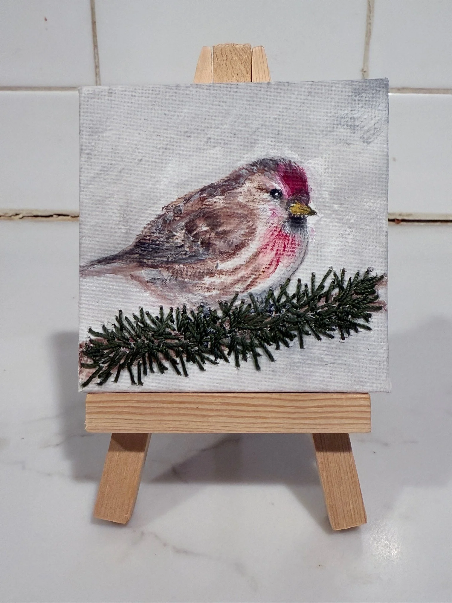 Inspiration: My spirit animal: the Borb. As birders and Audubon can explain, it’s the gloriously rotund silhouette of a winter bird puffed against the cold. This redpoll embodies that exquisite roundness.